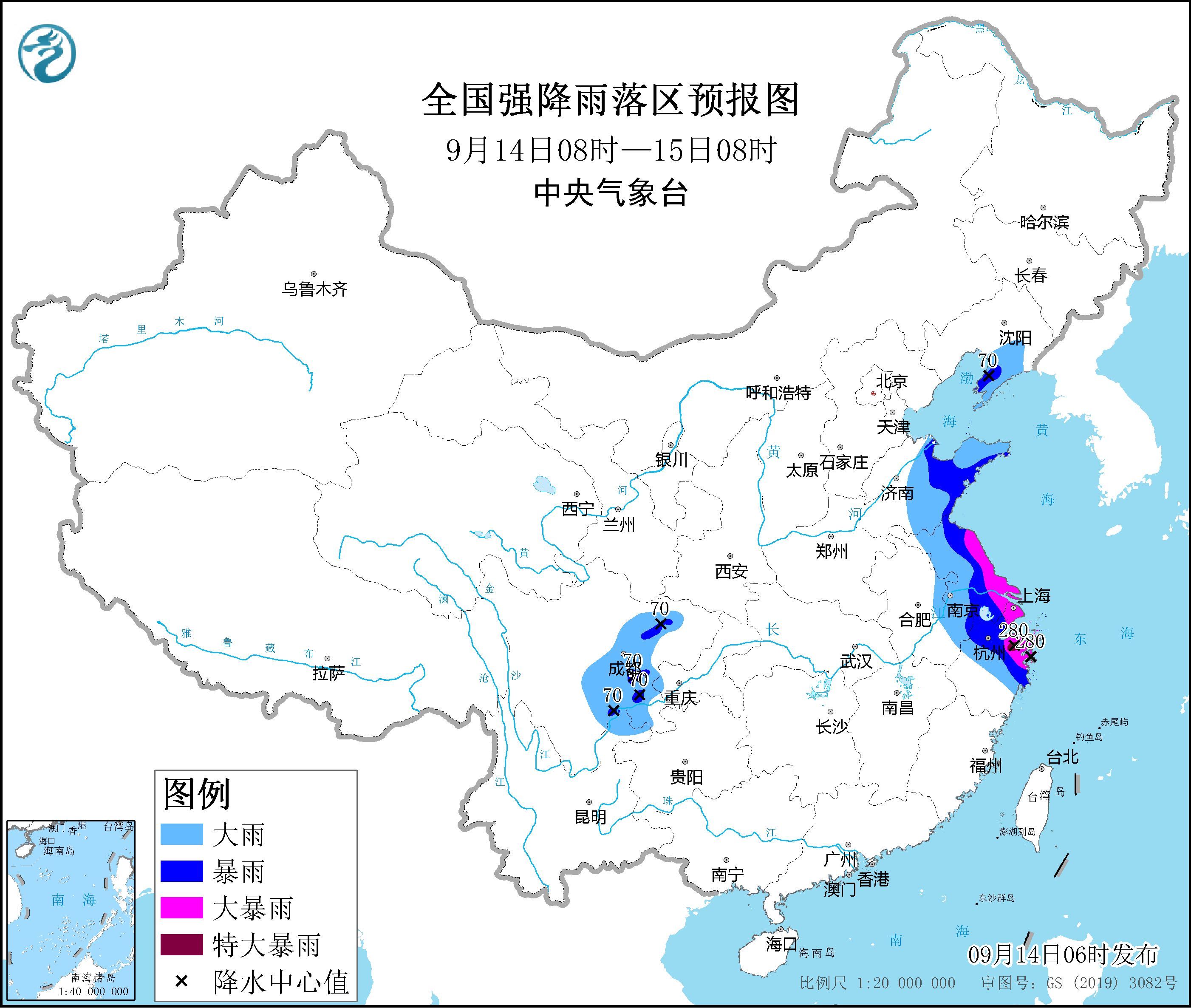 图2 全国强降雨落区预报图(9月14日08时-15日08时)