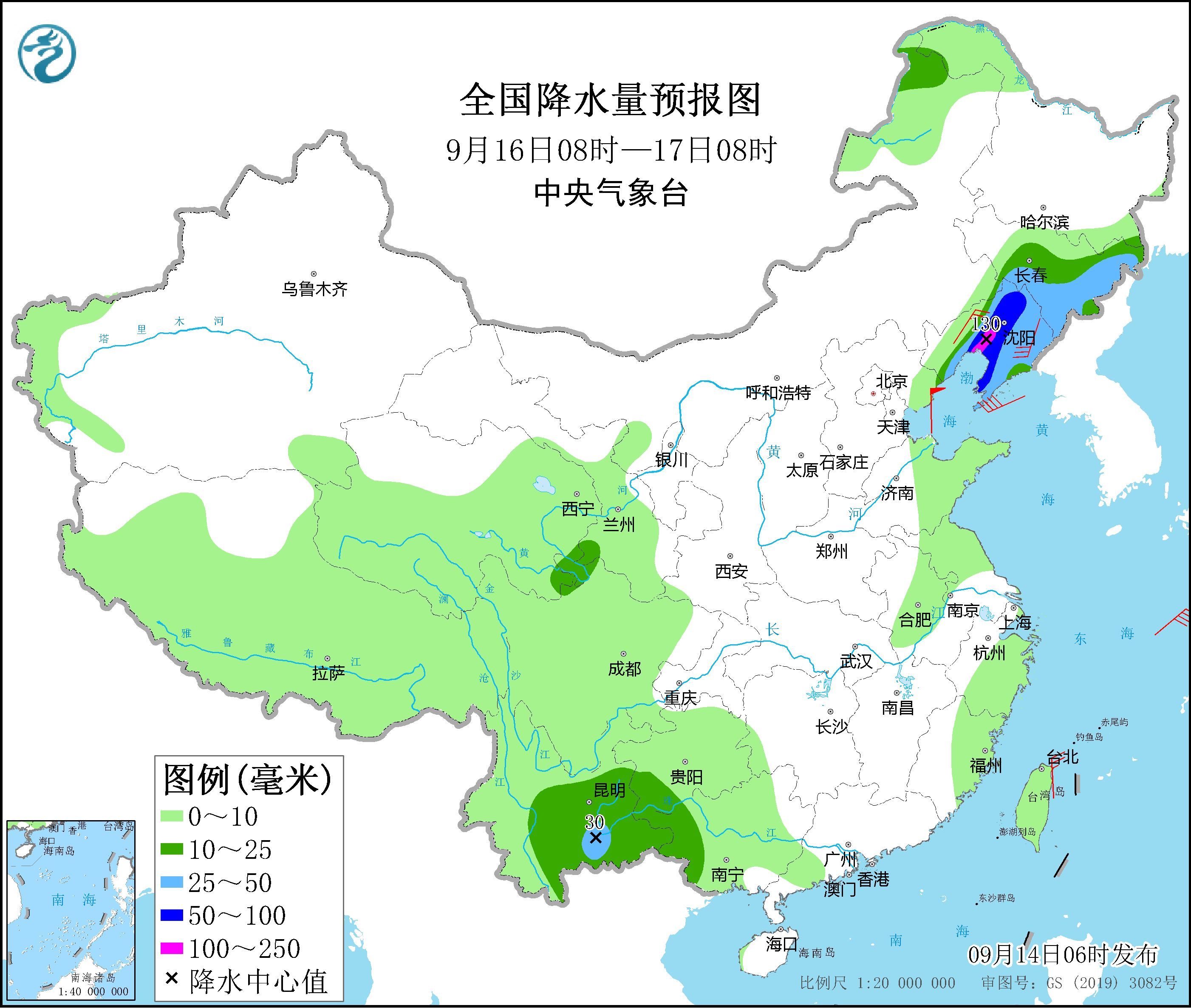 图5 全国降水量预报图(9月16日08时-17日08时)
